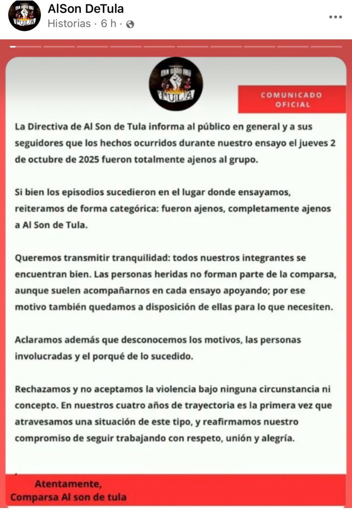Tras lo sucedido, la agrupación que se encontraba ensayando en el lugar de los hechos cuando se dio el ataque emitió un comunicado en el que indicó que las personas que fueron baleadas no pertenecen al grupo y que se encontraban mirando la actuación.