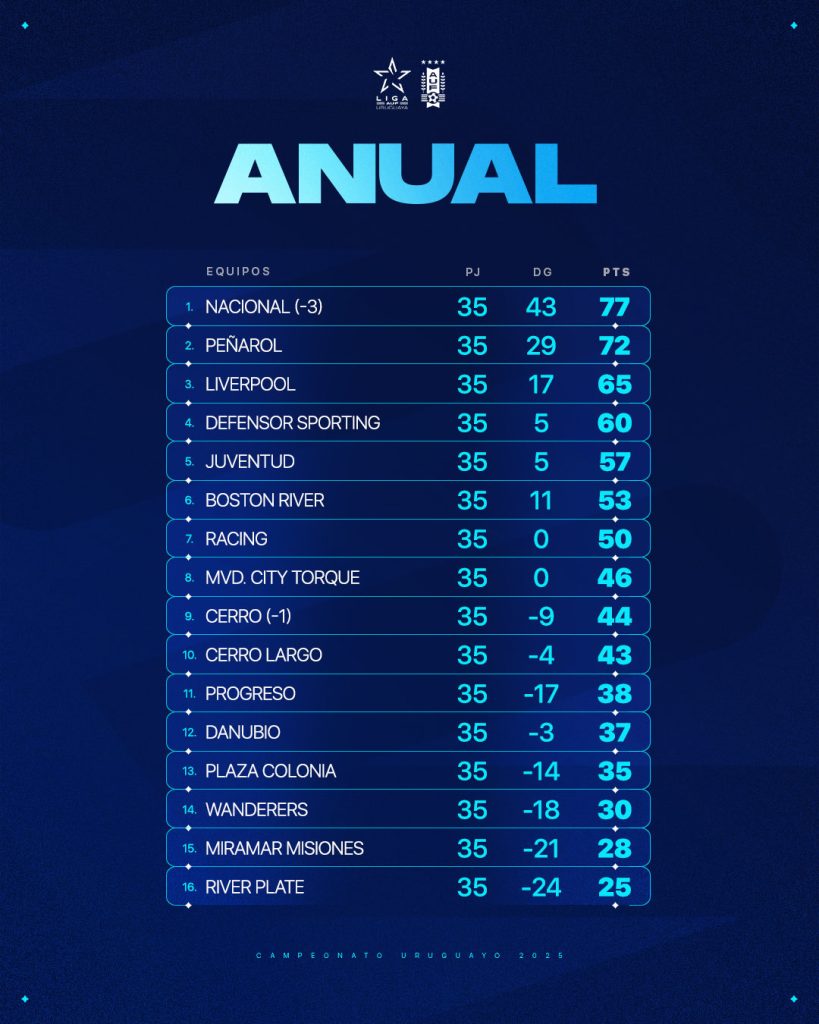 La tabla anual tiene a Nacional a punto de ganarla 77, Peñarol 72, Liverpool 65, Defensor Sporting 60, Juventud 57, Boston River 53, Racing 50 y Montevideo City Torque 46 (Hasta ahí ingresan a Copas Internacionales). Hay un cupo que podría salir de la final entre Peñarol y Plaza Colonia de Copa AUF Uruguay en el caso de que Plaza gane y no descienda en la Liga Uruguaya.
