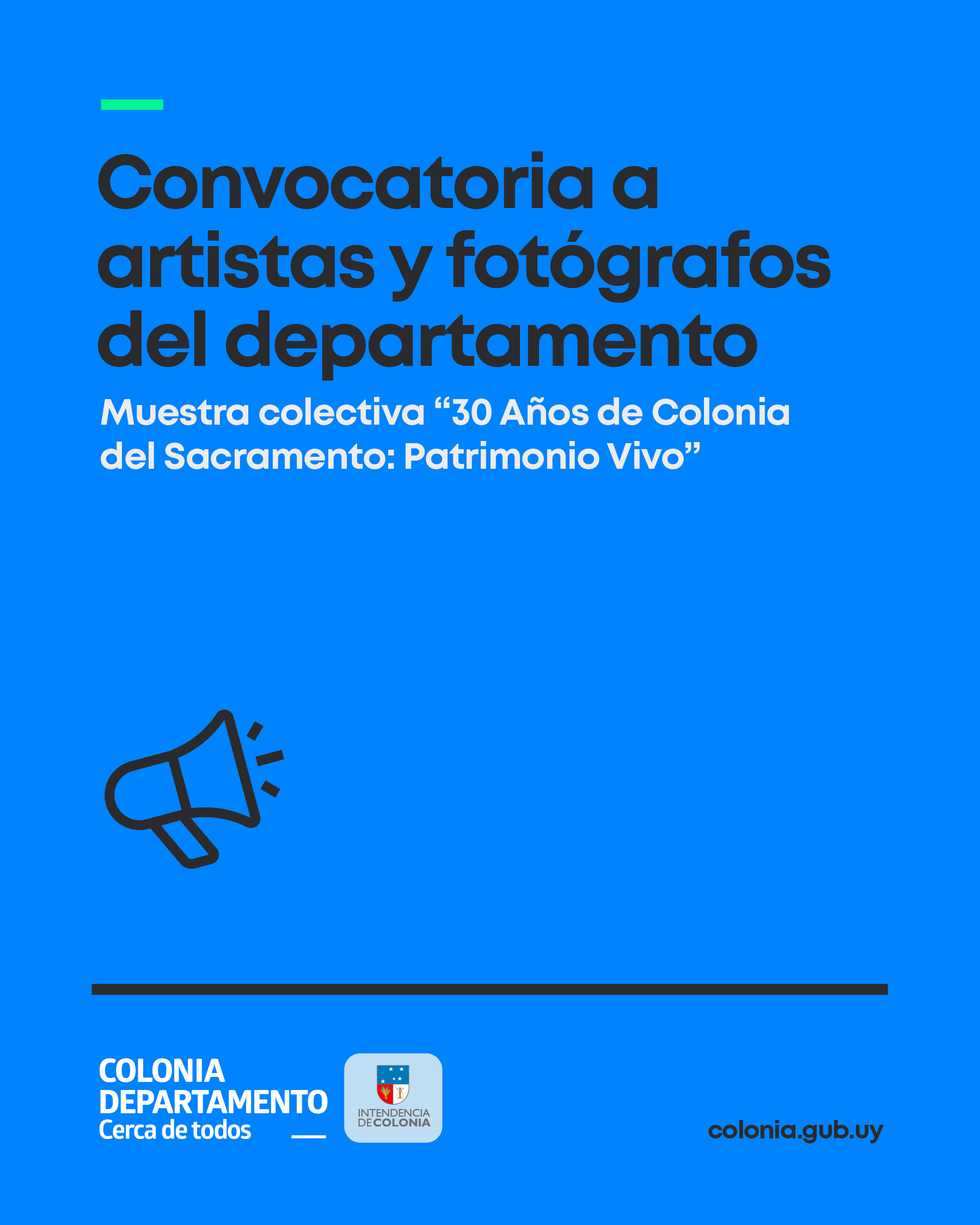 La Intendencia de Colonia, a través de la Dirección de Cultura, convoca a artistas plásticos y fotógrafos del departamento a participar en la muestra colectiva “30 Años de Colonia del Sacramento: Patrimonio Vivo”, en conmemoración del trigésimo aniversario de la declaratoria del Casco Histórico de Colonia del Sacramento como Patrimonio Cultural de la Humanidad por UNESCO (1995–2025).
