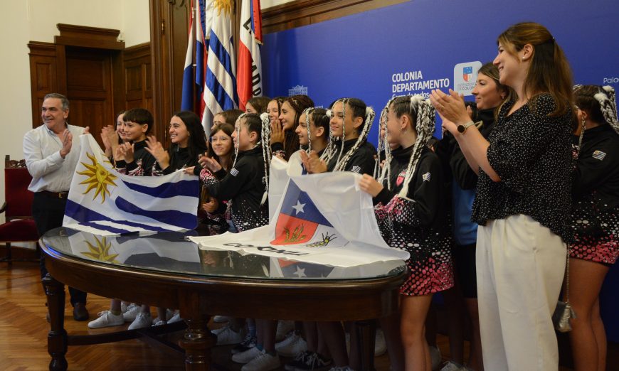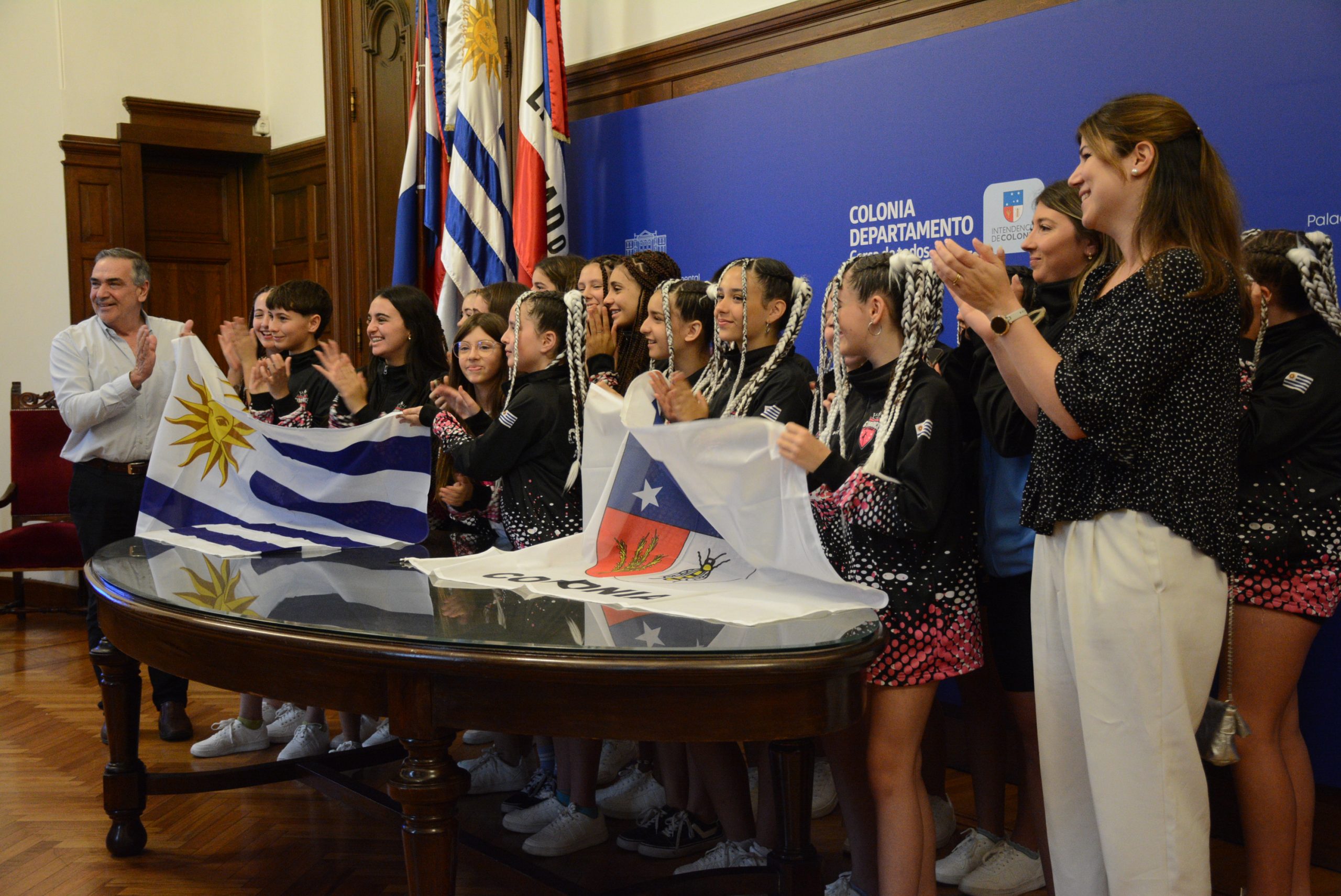 El Intendente de Colonia Guillermo A. Rodríguez, entregó un pabellón patrio y uno del Departamento de Colonia a una delegación de Gym Dance que nos representará internacionalmente.