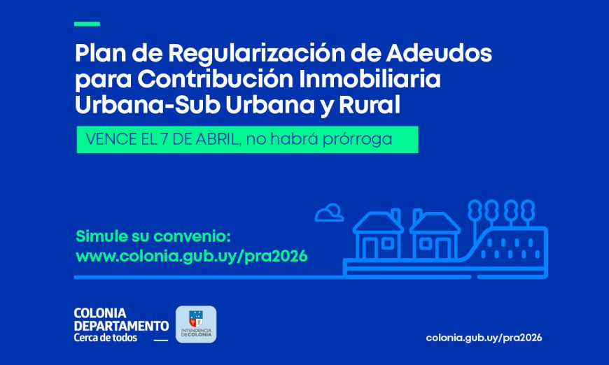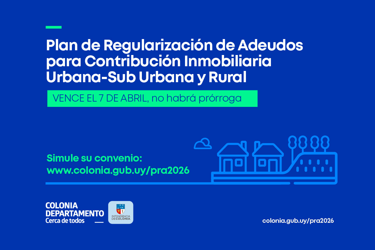La Intendencia de Colonia, a través del Departamento de Hacienda y Administración comunica que el Plan de Regularización de Adeudos para Contribución Inmobiliaria Urbana-Sub Urbana y Rural, vence el 7 de abril, y no habrá prórroga.