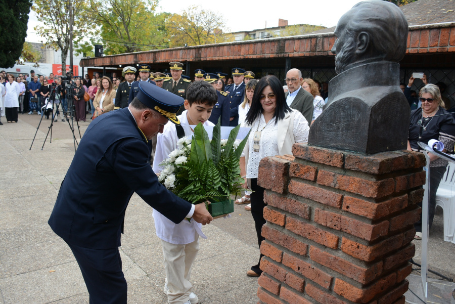 Por último, se colocó una ofrenda floral pie del busto ubicado en el patio de ese centro de enseñanza por parte de un alumno, del Jefe de Policía Comisario General (r) Paulo Costa y de la Inspectora Departamental, para luego interpretar la Marcha «Mi Bandera» y la posterior desconcentración de abanderados y escoltas.