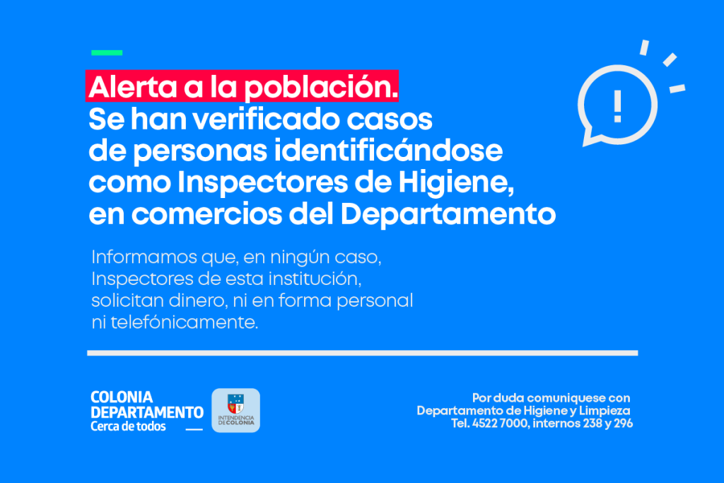 La Intendencia de Colonia, comunica a la población que se han verificado casos de llamados telefónicos identificándose como Inspectores de Higiene, en comercios de la ciudad de Carmelo.