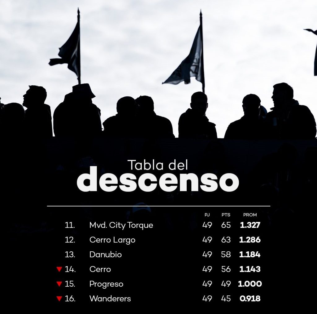 La tabla de posiciones tiene a Racing puntero con 27 puntos, 23 tiene Peñarol y Deportivo Maldonado, Albion y Nacional 19, Central Español 18, Defensor Sporting 17, Montevideo City Torque y Liverpool 16, Danubio 15, Cerro Largo Boston River y Wanderers 14, con 10 Cerro y Progreso, cierra la tabla Juventud De Las Piedras con 8 puntos.